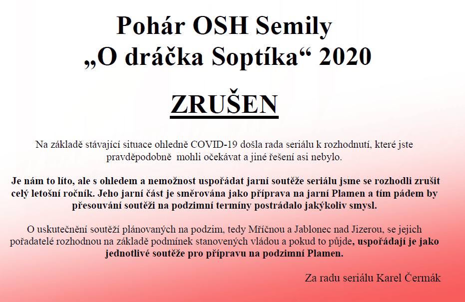 Vážení vedoucí mládeže, mám pro vás nepříjemnou zprávu. Bohužel jsem se po zvážení všech okolností rozhodl zrušit také podzimní kolo Hry Plamen. Situaci jsem konzultoval s krajskou hygienickou stanicí a s ostatními členy odborné rady. Není to lehké rozhodnutí. Vím, že přijde vniveč spousta vaší práce, které si vážím. Ve vládním nařízení sice je skulinka pro sportovce, ale v případě pořádání tak velké soutěže jdeme proti smyslu tohoto nařízení a v případě jakékoli nákazy bychom se kromě velké ostudy museli zodpovídat a obhajovat. V tuto chvíli nedokážu říci, zda soutěž rušíme, nebo jen odkládáme. V letošním roce určitě neproběhne. Můj osobní názor je, že ji nezvládneme ani na jaře. O dalším vývoji vás budeme informovat. Čeká vás těžký úkol, vysvětlit to vašim dětem. Jsem na tom stejně. Pokud vás napadne nějaká aktivita, kterou bychom mohli za současné situace pro děti uspořádat, dejte mi prosím vědět. Doufám, že vám tato nepříjemná situace nevezme chuť do další hasičské práce. S pozdravem Pavel Štěpánek, vedoucí OORM