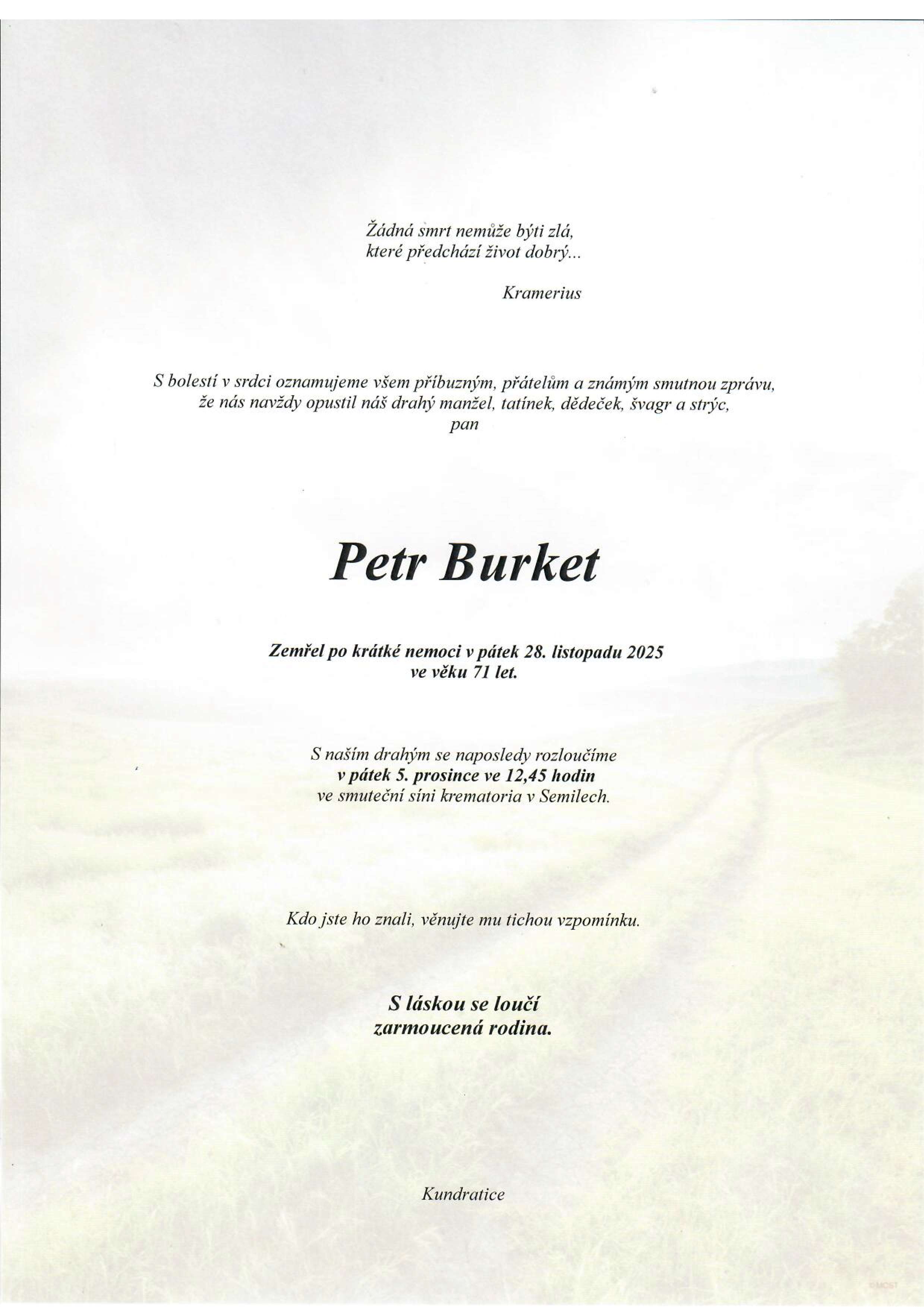 S hlubokým zármutkem oznamujeme, že dne 28. listopadu 2025 nás ve věku 70 let navždy opustil bratr Petr Burket.